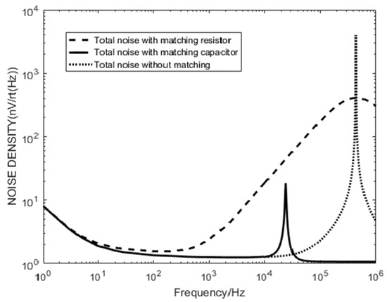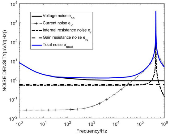 It can be seen from Figure 9 that, after removing the matching resistor, the total noise of the sensor is significantly reduced around 1 kHz. The op amp voltage noise accounts for the largest proportion of the global noise before 10 kHz, which is limited by the low noise period and 1/f noise. The noise is reduced, the current noise increases with the increase of frequency, and the main component is occupied after 10 kHz. Since the system measurement frequency band is 1–10 kHz and the frequency is higher than 10 kHz, the noise is disturbed. Therefore, consider adding matching capacitors to adjust the resonance frequency.