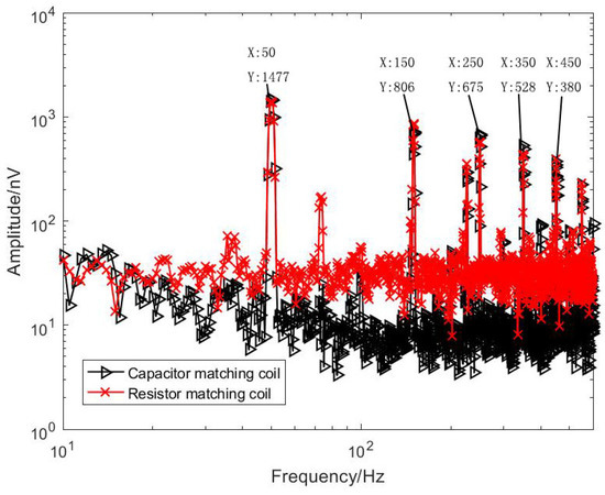 It can be seen from Figure 14 that, at the signal frequencies of 50 Hz, 150 Hz, 250 Hz, 350 Hz and 450 Hz, the optimized coil obtains a magnetic field signal with almost the same amplitude as that before the optimization, which is sufficient to explain that the homemade coil sensor measures the magnetic field signal accurately. Since the equivalent noise level of the unmatched coil is lower than that of the resistance-matched coil, the baseline of the signal measured by the unmatched sensor at the low frequency band is significantly lower than that of the resistance-matched sensor, reaching the level of 10 nV. As shown in Figure 15, the optimized coil noise performance is better in the 1–10 kHz band. In summary, for a semi-aeronautical frequency-domain electromagnetic detection system, the coil without matching resistors has a lower noise level for a low-frequency frequency-domain detection system and meets the detection requirements.