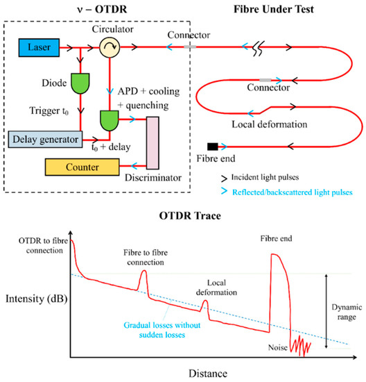 Working principles of photon-counting Optical Time Domain Reflectometer (ν-OTDR) [26] and typical OTDR trace.