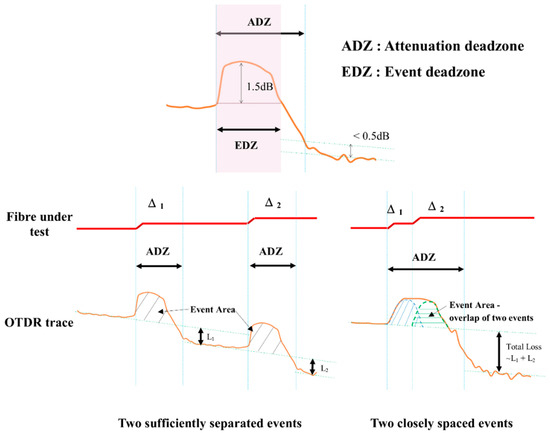 The reflective events (e.g., connections and fibre deformation) can trigger the decoupling of higher-order modes (or mode filter effects) and event dead zones. The decoupling of higher-order modes can reduce the signal intensity of a successive event within the influencing length, which is dependent on the mode-coupling length in the POFs (~10 m for step-indexed POFs [35] and ~2 m for gradient-index POFs [29]). If a reflective event takes place within the event dead zone (EDZ) triggered by the preceding event, the location of the latter event cannot be pinpointed precisely. The width of the dead zone is influenced by the pulse width, the receiver recovery time, and the loss magnitude or return losses (RL) of the events. The event dead zone and its effects on the measurement by OTDR are illustrated in Figure 2.
