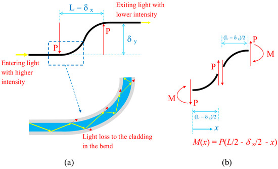 To correlate the optical bend loss with the shear displacement, the curvature profile of the deformed POF segment shall be evaluated. The large deflection beam theory is employed here, and the curvature-bending moment relationship can be described by the classic Bernoulli–Euler equation: