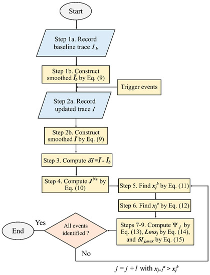 Step 1: The initial OTDR trace is recorded and then smoothed by Equation (9) to get the baseline trace .