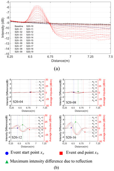 Single shear event with a deformed length of 20 mm: (a) ν-OTDR traces; (b) locating the event start points, the endpoints, and the maximum reflection intensity using the intensity difference (left axis) methods with the impulse for different (right axis).