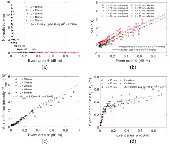 As shown in Figure 7b, the event area is linear with the loss and the non-zero intercept on the axis of the loss is the expected error due to the mismeasurement. The event area is also linear with the maximum linear intensity (Figure 7c). This can be adjusted by subtracting the originally measured loss by the intercept of the event area vs loss plot. The adjusted loss of each test is plotted in Figure 7b. Moreover, it can be observed from Figure 7a, the larger the event area produced, the more accurate in locating the deflection events. When the event area is larger than 0.2 dBm, the normalised error is generally less than 0.1. Despite the higher normalised error for small deflection events, the proposed technique can detect and locate the events with an error within 0.5 m which is generally acceptable for monitoring of large-scale civil engineering structures. To calibrate the constants , , and of the power loss coefficient given by Equation (1), the analytical total loss over the deformed length, is evaluated by
