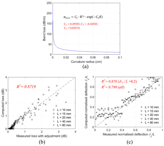 (a) The bend loss vs curvature radius relationship and the comparisons of the computed with the measured (b) loss and (c) normalised deflections.