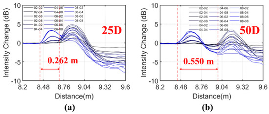 The maximum intensity change due to reflection can be correlated to the maximum deflection magnitude (Figure 11b) instead of the total deflection magnitude. Similar to the loss-deflection relationships, high variations can be observed in the reflection intensity–deflection relationships of series 25D and 50D. Highly scattered results are observed for series 25D due to the strong effects of superposition of closely-spaced backscatter events and mode decoupling. Therefore, the reflection intensity may not be suitable for deflection measurement if closely spaced events are expected.