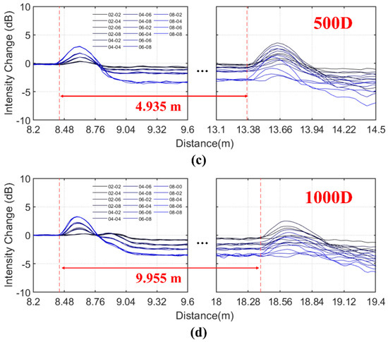 Closely spaced events will affect each other, and this increases the difficulty in characterising the properties of individual events from the OTDR signals. For continuous structural monitoring, the sensing technique must have the ability to detect multiple events. To this regard, the OTDR signals under double shear events with separations of 25 cm, 50 cm, 5 m, and 10 m denoted as test series 25D, 50D, 500D, and 1000D, respectively, are investigated in this section. The deformed length was 20 mm. The nomenclature of the tests is illustrated as follows: 25D-04-06 is a double shear test with a separation of 25 cm, the normalised deflection magnitudes of the first d1 and the second shear d2 are 0.4 and 0.6, respectively. The tested intensity changes in all test series are summarised in Figure 9. The relationships between the loss and maximum intensity changes with the individual deflection magnitudes are summarised in Figure 10.