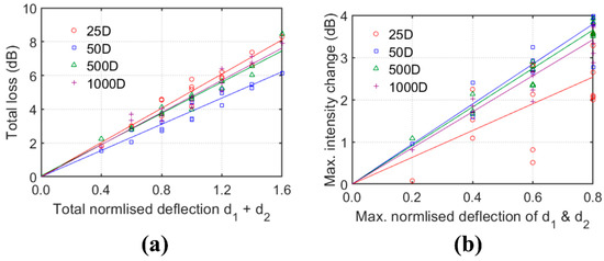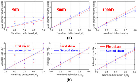The light modes decoupled and strongly backscattered at the deformed length. When the two events are too close, significant spatial superposition of closely spaced backscatter events of the light modes can occur. As shown in Figure 9a, the resulted OTDR signals of the two shear events in series 25D partly overlap each other. The second event could be hardly located by the proposed technique when the first shear magnitude was larger than the second shear magnitude (e.g., d1 > 0.6 and d2 < 0.4). The loss due to the first shear was cancelled by the reflection due to the second shear and, hence, only the total loss after the second shear can be evaluated. Although the positions of the two shear events can be clearly identified in test series 50D with separation of 0.5 m, the effects of decoupling and superposition of backscatter events that caused high variations in the deflection–loss and deflection–reflection intensity relationships of individual events were still quite significant (Figure 10).