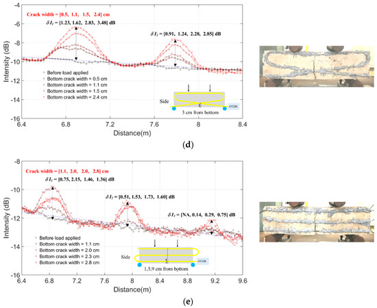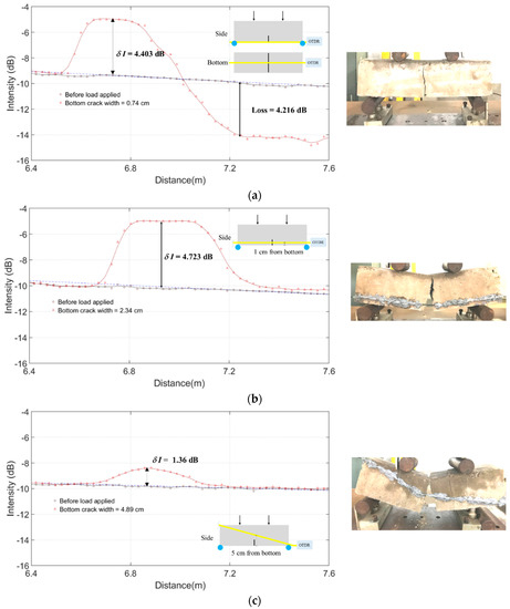 In specimen D, as shown in Figure 12c, the POF was also purely stretched, and only the diagonal component of the crack opening was sensed by the POF. Therefore, the trace response was quite weak that even when the crack opening reached 4.89 cm, the reflection intensity (1.36 dB) was not even half of that for specimen SB (4.723 dB).