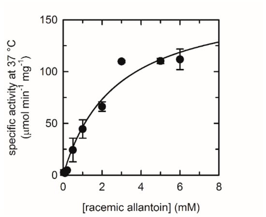 The activity of an enzyme is defined through the determination of two main parameters: the turnover number (kcat), representing the number of substrate molecules processed in a time unit, and the Michaelis constant (KM), roughly representing the enzyme apparent affinity for its substrate. From these two values it is possible to obtain the catalytic efficiency (also known as specificity constant, kcat/KM), which is best used as comparative parameter between enzymatic activities in different conditions [,,,]. More specifically, catalytic efficiency represents the efficiency of the encounter complex to form and give the reaction product. This value for allantoinase is around 7.5 × 104 M−1·s−1 and falls in the median range of reported enzymatic activities belonging to the primary metabolism of nucleotides [].
