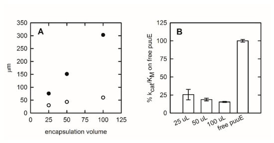 Catalytic parameters and catalytic efficiency of free and encapsulated puuE on (S)-allantoin in 20 mM potassium phosphate, pH 7.4, at 37 °C. For the free enzyme, kcat and KM values were obtained by fitting kinetic data to the Michaelis–Menten equation and the catalytic efficiency was calculated as the ratio between the turnover number and Michaelis constant. Catalytic efficiency for entrapped puuE was obtained on single kinetics in the presence of 40 µM racemic allantoin, applying Equation (1).