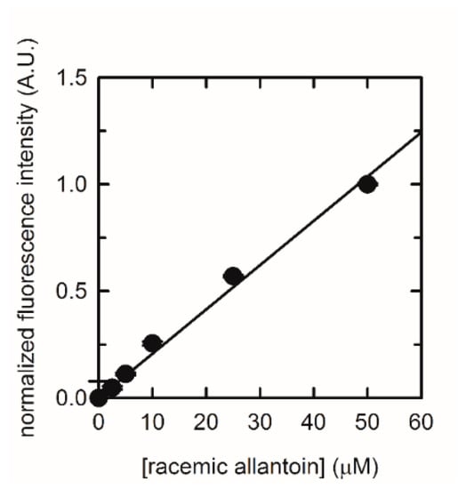 The effective suitability of immobilized puuE in biosensing applications was tested through its application in the enzymatic step of an allantoin quantification assay recently developed by our group []. Thin layers of silica gel containing 300 ng of recombinant puuE were layered on the internal part of the caps of 0.2 mL vials. Increasing amounts of racemic allantoin, ranging from 0.5 to 50 µM in 100 mM potassium phosphate, pH 7.4, were converted into allantoate by incubating samples upside down in 0.2 mL vials sealed by the functionalized caps. After a fixed reaction time, caps were removed and stored for reuse []. The fluorescence values obtained from the plate reading were subtracted of the blank (a reaction performed in buffer in the absence of allantoin) and normalized, and their dependence on allantoin concentration was fitted to a linear equation (Figure 5). The analysis provided a linear response in the explored range, confirming that encapsulated allantoinase can represent a valuable option in the proposed routine assay for allantoin quantification.
