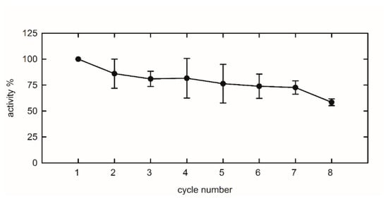Generally, one of the pursued advantages in using an immobilized enzyme is its increased stability and, as a consequence, its disposition to long-term storage and reusability. We tested this feature in our allantoin biosensor, employing the same encapsulated puuE batch for several cycles of reuse. The reactions were performed on aliquots of the same batch containing 0.2 mM racemic allantoin in 20 mM potassium phosphate, pH 7.4, and the consumption of (S)-allantoin was checked by recording the CD signal of the solutions. The end-point values after ten minutes of reaction were converted into activity percentage with respect to the first cycle (Figure 6). The reported graph shows how, after eight cycles of reuse, allantoinase retains more than 50% of the initial activity, indicating that this strategy is applicable to the development of a recyclable enzymatic device for allantoin quantification.