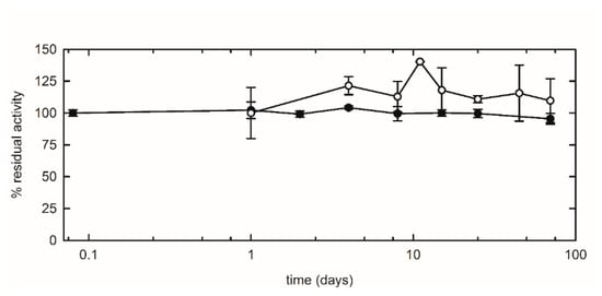 The long-term storage stability of encapsulated puuE was assessed as an additional central condition for its application as a biosensor. The enzymatic activity of single-use batches of entrapped allantoinase was monitored for several months and the results were compared with the free enzyme stored in solution at 4 °C. Allantoinase demonstrated to be a remarkably stable enzyme per se, and its stability was retained even after encapsulation, keeping an almost unaltered activity over three months of storage (Figure 8).