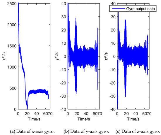 Gyro is the core component of the projectile attitude measurement. Its accuracy and real-time performance affect the flight and control safety of the projectile. Due to the high dynamic characteristics of projectile in flight, such as high overload and high speed [1], there are many uncertain factors, such as the complex working environment, which cause interference to the measurement of gyro and affect its measurement accuracy [2,3]. Figure 1 shows a group of actual measurement data of gyro. It can be seen that the dynamic characteristics of the projectile flight environment are strong, the data fluctuate greatly, and the introduced nonlinear noise has a great influence on the attitude measurement. Therefore, in the high dynamic environment, it is the key to remove the gyro noise effectively for accurate measurement of the projectile attitude.