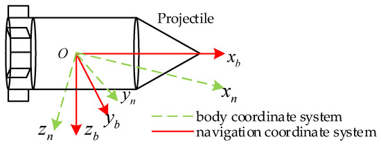 The yaw angle , pitch angle and roll angle of the projectile attitude are a set of Euler angles. The angular position relationship of the body coordinate system () relative to the navigation coordinate system () are described by the Euler angles. The definition of coordinate system is shown in Figure 4.