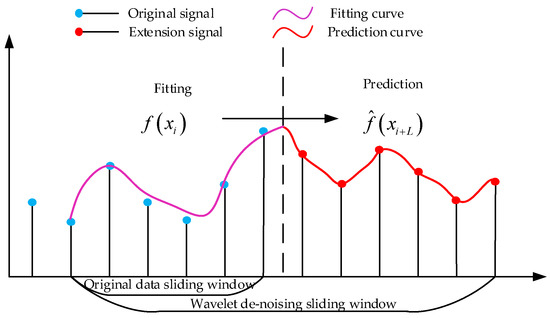For the original data sliding window with length L, the extension length is also L, then a new sliding window data are formed by x-axis prediction and fitting results as follows:
