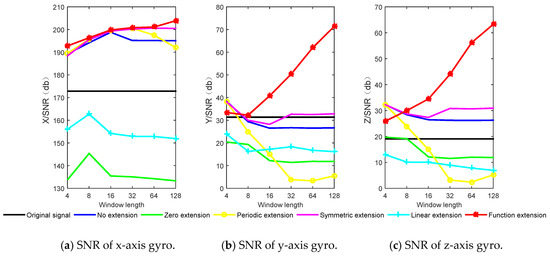 It can be seen from Table 2 that compared with the original signal, for the x-axis, the zero extension and the linear extension do not improve the SNR, and the performance of the function extension method increases the most. For the y-axis, only symmetric extension and function extension have PI. Due to the high dynamic environment, the y-axis data changes drastically in a short time, other extension methods are not suitable, and the PI of the function extension method is 127.69%, which proves the practicability of this method. For the z-axis, no extension, symmetric extension and function extension have PI.