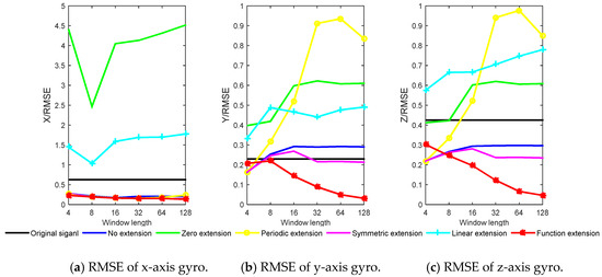 It can be seen from Figure 7 and Figure 8 that the function extension method is superior to other methods, and with the increase of window length, the SNR increases, and RMSE decreases. For the three axial gyros, the results of zero extension and linear extension are not as good as the original signal, which indicates that the two methods are not applicable in high dynamic environment. For the y-axis and the z-axis, the effect of no extension and periodic extension is poor, which indicates that the real-time wavelet threshold de-noising for these two axes needs to be extended, and the extension method has a great influence on the de-noising effect. The performance improvement (PI) is defined as the increase percentage of SNR for different extension methods relative to the original signal. The window length L = 128 is taken as an ex-ample. The SNR and PI results of different methods are shown in Table 2.
