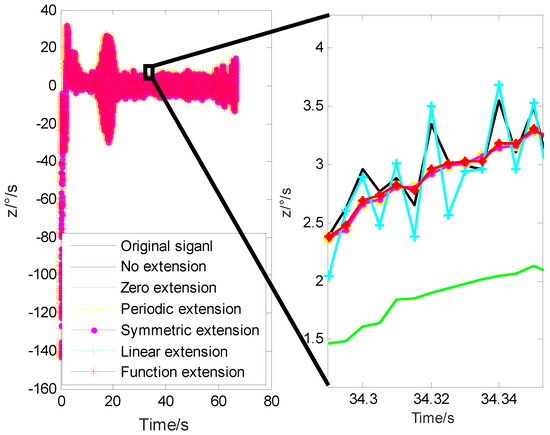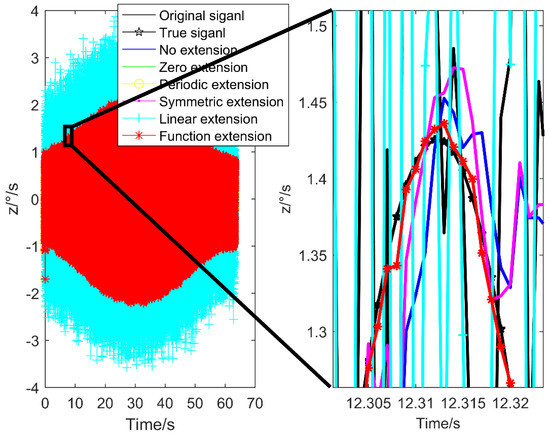 In order to further illustrate the applicability of the proposed method, taking the z-axis signal as an example, the de-noising results using different extension methods are shown in Figure 11.
