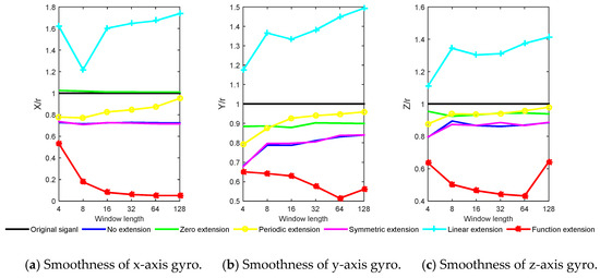 It can be seen from Figure 10 that the function extension method is superior to other methods, and with the window length increases, the smoothness decreases within 64. Because the actual projectile motion is more complicated than the simulation motion, it may contain regular precession, general angular velocity motion and random angular vibration. Therefore, the simulation results are different from the experiment results, but in terms of the overall trend, the simulation results and experiment results have certain commonality. For the three axial gyro de-noising results, the linear extension results are not as good as the original signal, and the periodic extension and zero extension are not good, which is similar to the simulation results.