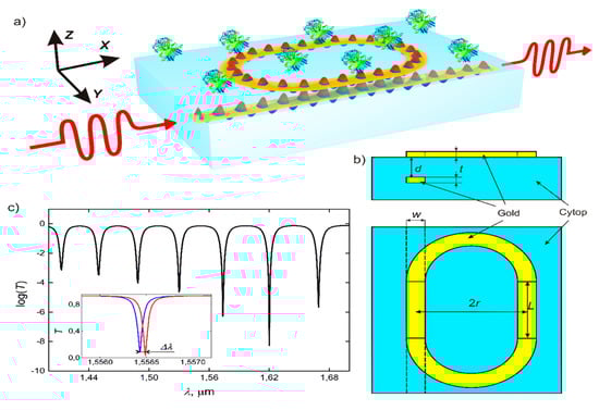 In recent years, researchers proposed various schemes of optical label-free biosensors, which simultaneously have high sensitivity and a small footprint, allowing their integration into electronic devices [,]. The operation principle of most optical biosensors is based on the detection of changes in optical properties induced by the adsorption of analyzed substances on the surface of optical structures. An efficient way to track changes in refractive index (RI) is by using photonic micro-ring resonators [,,,,,,,] or interferometers [,] due to the strong dependence of their optical resonance conditions on the optical properties of the surrounding medium. The development of plasmonics significantly influenced modern biosensing technology and, currently, most commercial optical biosensors are based on surface plasmon resonance (SPR) excited using the Kretschmann configuration [,,,,,].