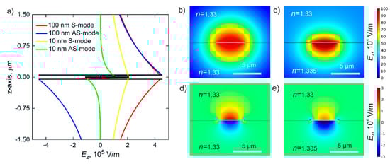 - In theory, the AS-mode provides higher sensitivity than the S-mode as shown in Figure 5. However, the AS-mode propagation length is significantly less than that for the S-mode and even less than the resonator length, which makes optical biosensing highly inefficient. The situation can be different for optical biosensors exploiting plasmonic schemes based on ultrathin metal films and plasmonic two-dimensional (2D) materials [,,]. As shown in Figure 5, the sensitivity to RI increases with the decreasing thickness of the plasmonic waveguide.