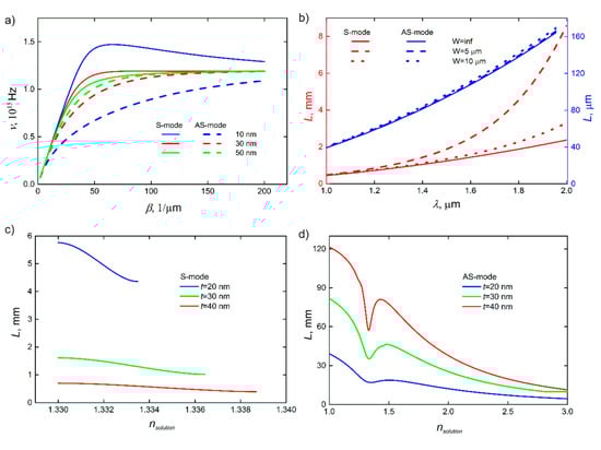 Figure 3a shows dispersion curves obtained using Equation (4) for different thicknesses of the metal film. For thicker films, dispersion of surface plasmons tends to that for surface plasmon waves excited on the surface of bulk metal. In addition, surface plasmons in thick films show less response to the RI changes from one side of the metal films, lowering the sensitivity of biosensing. Another important quality of surface plasmons that depends on the thickness of the metal layer is the propagation length. From Equation (4), it can be represented from the imaginary part of the wavevector for S and AS modes.