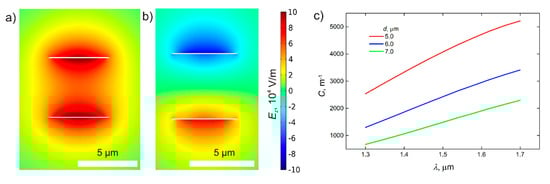 Coupling of the waveguide and the resonator is realized by their vertical stacking. Next, we find the coupling constant, which describes the energy transmission between two parallel plasmonic strip waveguides. Instead of one long-range S-mode, this system supports two modes with transverse electric fields around waveguides oscillating in phase and antiphase (Figure 4a). In this case, the coupling constant is proportional to the difference in wavenumbers corresponding to these modes, i.e., , where n is an effective mode index and n0 is the RI of the dielectric []. Thus, for thicker waveguides, the coupling constant for the waveguide and resonator is larger, providing more effective detection of RI changes. The coupling constants obtained by COMSOL simulations for different plasmonic strip waveguides are represented in Figure 4c.