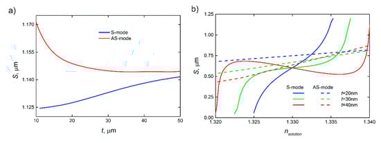 Therefore, the sensitivity mainly depends on the thickness of the waveguide and RI of the surrounding media, because the wavevector of the guided plasmonic mode is unaffected by parameters of the system such as the length of the resonator and the distance between the waveguide and the resonator. The sensitivity to RI changes shows different dependence for S- and AS-modes, which increase and decrease, respectively, with the thickness of the gold waveguide (Figure 5a). However, for instance, for LRSPP, the total increase in the sensitivity is just about 10% for the thickness increase from 10 to 50 nm. Thus, for the sake of practical application, the waveguide thickness can be chosen considering its other impacts on the device performance.