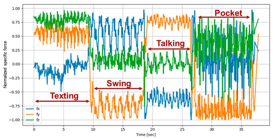 The angular velocity measurements were not normalized since the measurements contain noise and other error terms, which can be mistreated by the classifier, if normalized, particularly in situations when the actual angular velocity can be near zero (or in the same order of the noises), such as in texting or talking. On the other hand, the same phenomena are not valid for the accelerometers’ measurements since the gravity is a bigger quantity (1 g) than the accelerometer noise and other error terms (mg) and also due to the acceleration the pedestrian experiences while walking. Therefore, we followed the common practice in machine learning to normalize the accelerometer recordings.