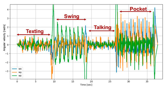 In the same manner, an example of the angular velocity vector as measured by smartphone gyroscopes is shown in Figure 3. The difference between the four smartphone modes in the recordings can be clearly seen in the figure. As expected, during the texting and talking modes, the angular velocity oscillates around zero. Thus, if normalized, it would blur the difference between the four smartphone locations and as a consequence harden the classification process. Therefore, the measured angular velocity: