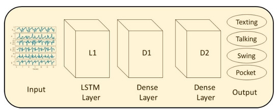 In general, LSTM is a variation of recurrent neural networks, which solves their vanishing gradient problem of learning long-term dependencies by using a gating mechanism [27]. The LSTM architecture that was used for the evaluation of SLR is presented in Figure 4. It receives the specific force and angular velocity vectors as input to the first LSTM layer (L1). The second layer is a fully connected layer (D1) as well as the third layer (D2), which outputs the smartphone location. The default parameters for the network were set as follows: L1 has 128 units, D1 has 32 with a rectified linear unit (ReLU) activation, and D2 has 4 with Softmax activation.