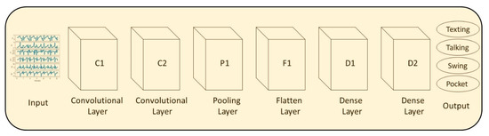 One-dimensional CNN are simply neural networks that use convolution in place of general matrix multiplication in at least one of their layers. The convolutions are used as layers to filter inputs for useful information/features for the required task [28]. The CNN architecture that was used for the evaluation of SLR is presented in Figure 5. It receives the specific force and angular velocity vectors as input to the first CNN layer, C1. C1 has 32 units with an ReLU activation. The next layer is also a 1D-CNN, C2, with the same parameters as C1. After dropout of 0.6, the next layer is a polling layer of size 2 followed by a flattened layer to set the dimensions to the following dense layer, D1. D1 has 32 units with an ReLU activation function followed by a second dense layer, D2, with Softmax activation that outputs the SLR result.