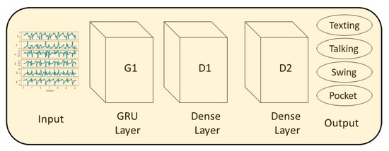 GRU is basically an LSTM without an output gate. The main difference with the LSTM is that a single gating unit simultaneously controls the forgetting factor and the decision to update the state unit [27]. The GRU architecture that was used for the evaluation of SLR is presented in Figure 6. It receives the specific force and angular velocity vectors as input to the first GRU layer. Then, just like in the LSTM architecture, the second layer is a fully connected layer as well as the third layer, which outputs the smartphone location. The default parameters for the network were set as follows: G1 has 128 units, D1 has 32 with ReLU activation, and D2 has 4 with Softmax activation.