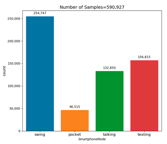 To summarize, eight different datasets were used to evaluate the proposed approach. This combination of datasets resulted in the largest dataset that has been used for the purpose of SLR. It contains 107 people with about 31 h of recording, with varying recoding conditions and user walking dynamics. The distribution of the samples from all datasets to the four smartphone locations is presented in Figure 9. Since the dataset was constructed from smaller different datasets, not necessarily constructed for the SLR task, the distribution is not balanced between the four modes. Nevertheless, each smartphone mode has more than 200,000 samples.