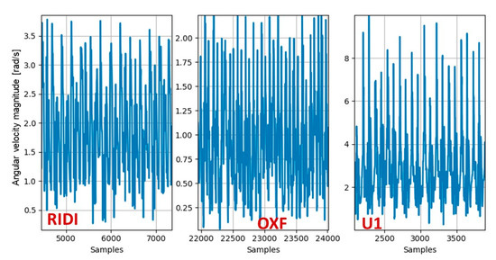 Each user has different dynamics even in the same smartphone location. An example is presented in Figure 10. It was produced for a smartphone in the pocket mode from three users, each one from a different dataset (RIDI, OXF, and U1). The plots show the angular velocity magnitude for a random portion of samples. As can be seen, the maximum value and other statistical properties differ between the three.