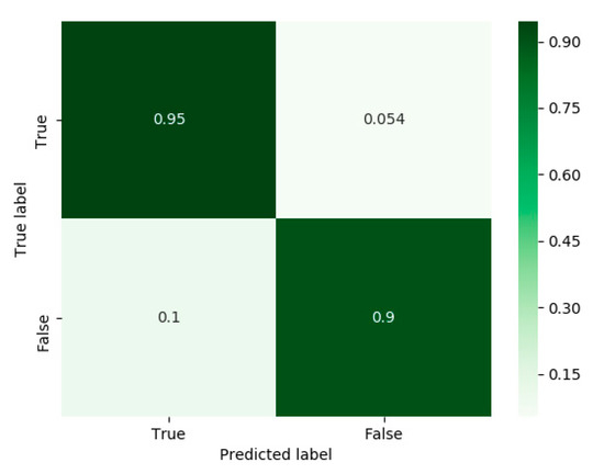 The binary network architecture was chosen to be a dense neural network with a structure of 128-64-1 units. The classification performance of the binary classifier is presented in Figure 12. As can be seen, it performs well in predicting both the true and false labels, with an accuracy of 95% and 90%, respectively. If a false label is predicted, the smartphone location is set to unknown; otherwise, when true label is detected, the proposed SLR architecture is applied to classify the smartphone location.