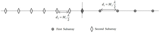 Consider a UCLA composed of two uniform linear subarrays, in which the numbers of sensors are and , and the inter-element spacings are and , respectively, with and being two coprime integers and λ the wavelength of incoming signals. One sensor element is shared by the two subarrays and is set as the reference point. The total number of sensors . Figure 1 shows the case of and .