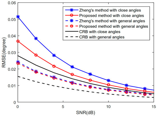Figure 2 depicts the performance of Zheng’s method in [15] and the proposed method versus the signal-to-noise ratio () with and , in both distantly separated angles situation (denoted as general angles in Figure 2), where signals come from , and a close angle situation, where signals come from . It can be seen that, in the distantly separated angles situation, the estimation performance is comparable to Zheng’s method; in the close angles situation, due to the reconstruction of the covariance matrix and the exploitation of the uniform property of subarrays, the proposed method has higher resolution and better estimation performance than Zheng’s method.