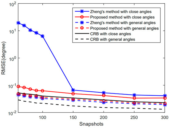 Figure 3 depicts the performance of the two methods versus the snapshots number with , in both the distantly separated angles situation (denoted as general angles in Figure 3) and close angles situation. As shown in the figure, in the distantly separated situation, the two methods can achieve similar estimation performance; in the close angles situation, the performance of Zheng’s method decreases greatly for small numbers of snapshots, as MUSIC depends on the accuracy of the estimated covariance matrix. On the contrary, benefiting from the reconstructed partially Toeplitz covariance matrix, the proposed method remains robust and reliable even in the case of a small snapshots number.
