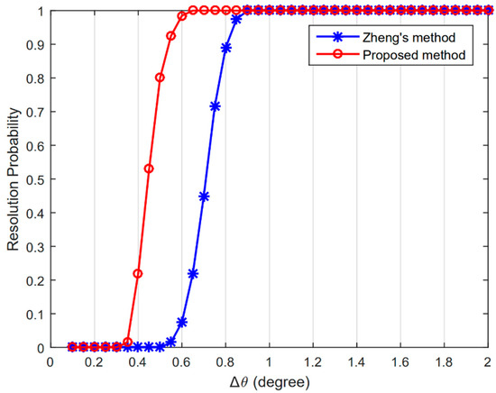 where and are the estimations of and , respectively [14,18]. Figure 4 shows the comparison of the resolution probability, which is calculated from the percentage of the success trials among Monte Carlo trials, of Zheng’s method in [15] and the proposed method, with and . It can be seen that, benefiting from the partial Toeplitz averaging, the accuracy of the estimated covariance matrix is enhanced, and the proposed method exhibits much better resolution performance.
