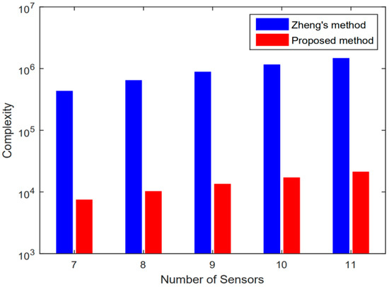 Based on root-MUSIC, the number of complex multiplications of the proposed method is , which is obviously lower than Zheng’s method, which is , where and denote the number of snapshots and the times of spectral searching respectively. The computational complexity comparison versus the number of sensors is given in Figure 5, with and . It can be seen that, without the exhaustive searching, the proposed method has much lower computational complexity with better resolution and estimation performance.