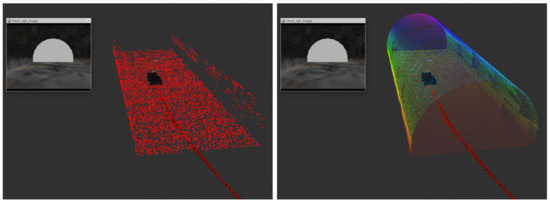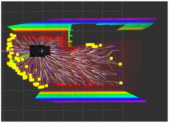 From 10 path-planning repetitions in the tunnel scenario, we are able to reduce the number of points of the original point cloud in a 93% on average. Besides filtering most of the points of the walls and the ceiling, the point cloud is downsampled to a resolution of 0.05 cm. Thus, we prevent the algorithm from wasting computation time on sampling and evaluating most of the invalid areas. This poses a clear advantage over other approaches, like that in Reference [12], that use the whole point cloud.