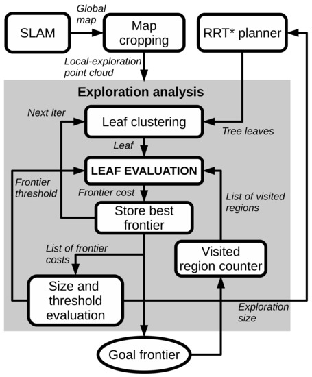 The counter of visited regions is in charge of storing all the exploration goals selected so far. Moreover, it counts the number of visits that each goal region has received. A visit is counted when the distance between the new frontier goal and any of the previous goals is lower than a distance threshold, . In this work, we have employed a distance of 1.5 m. Then, in the leaf evaluation, if the leaf is close to a region visited twice, the leaf is discarded as a possible frontier.
