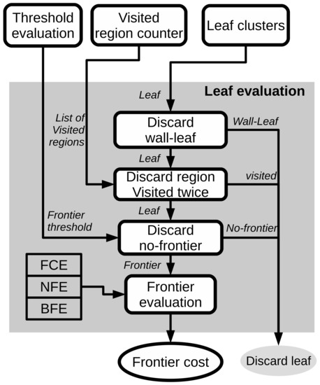 The number of leaves of the tree can be large and some can be very close to each other in terms of distance. Consequently, we propose performing a clustering of the leaves, as in Reference [21], with the purpose of avoiding unnecessary computations and speed up the process. Nevertheless, instead of taking the mean point of the cluster as a frontier point, a different method is employed. For each cluster detected, the leaf with the minimum path cost is chosen as a potential frontier point and the rest of the leaves are discarded. This way, the robot can reach the area through the most-efficient-path found.
