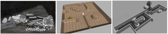 For evaluation of the approach, three different environments have been designed and simulated in Gazebo Robot Simulator (http://gazebosim.org/) along with the tracked robot employed in this work. Figure 6 shows a capture of these scenarios. The first environment (left image) is a tunnel with different obstacles in it. The tunnel has a width of around 4 m. The second environment (center image) is a squared area of 17 m × 17 m that presents a bumpy terrain with different ramps and obstacles. The third one (right image), is a set of connected corridors with ramps and fallen rocks inside. The dimensions of the bounding box that limits the space is around 35 m × 14.5 m.