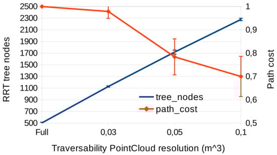 We have performed a comparison of the size of the RRT tree (number of tree nodes) and the costs of the paths according to different resolutions of point cloud for traversability. The planning has been repeated 10 times in the tunnel scenario (Figure 7).