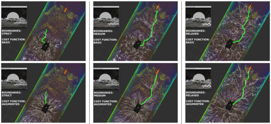Figure 8 shows a visual comparison of the paths obtained in the tunnel scenario with different combinations of the boundaries and the cost functions. As can be observed, the proposed cost function improves the paths of the basic cost function. Regarding the tree expansion, the strict boundaries only allow the expansion on the flat floor while the relaxed boundaries allow overcoming almost all the obstacles. Therefore, proper values for the boundaries must be chosen according to the robot capabilities of overcoming obstacles and climbing slopes.