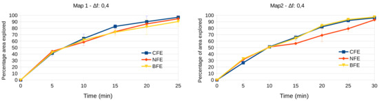 The results are presented in Figure 9 for map 1 and map 2 respectively. The percentage of area explored and their standard deviations along the time elapsed are shown. As can be seen, in both environments, the system is able to lead the vehicle to overcome all the obstacles and cover more than the of the area in a reasonable time in all the cases. Furthermore, the three frontier evaluators reach similar performance in terms of area covered.